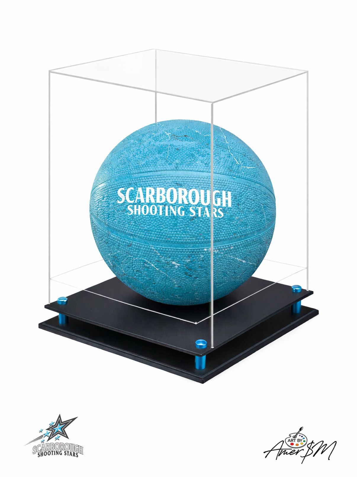 The Scarborough Shooting Stars logo is applied in white as the focal point, carefully positioned to integrate naturally with the curvature of the ball. The surface is then sealed in a high gloss resin and layered with diamond dust, creating depth, light refraction, and a refined finish that contrasts the raw texture beneath.