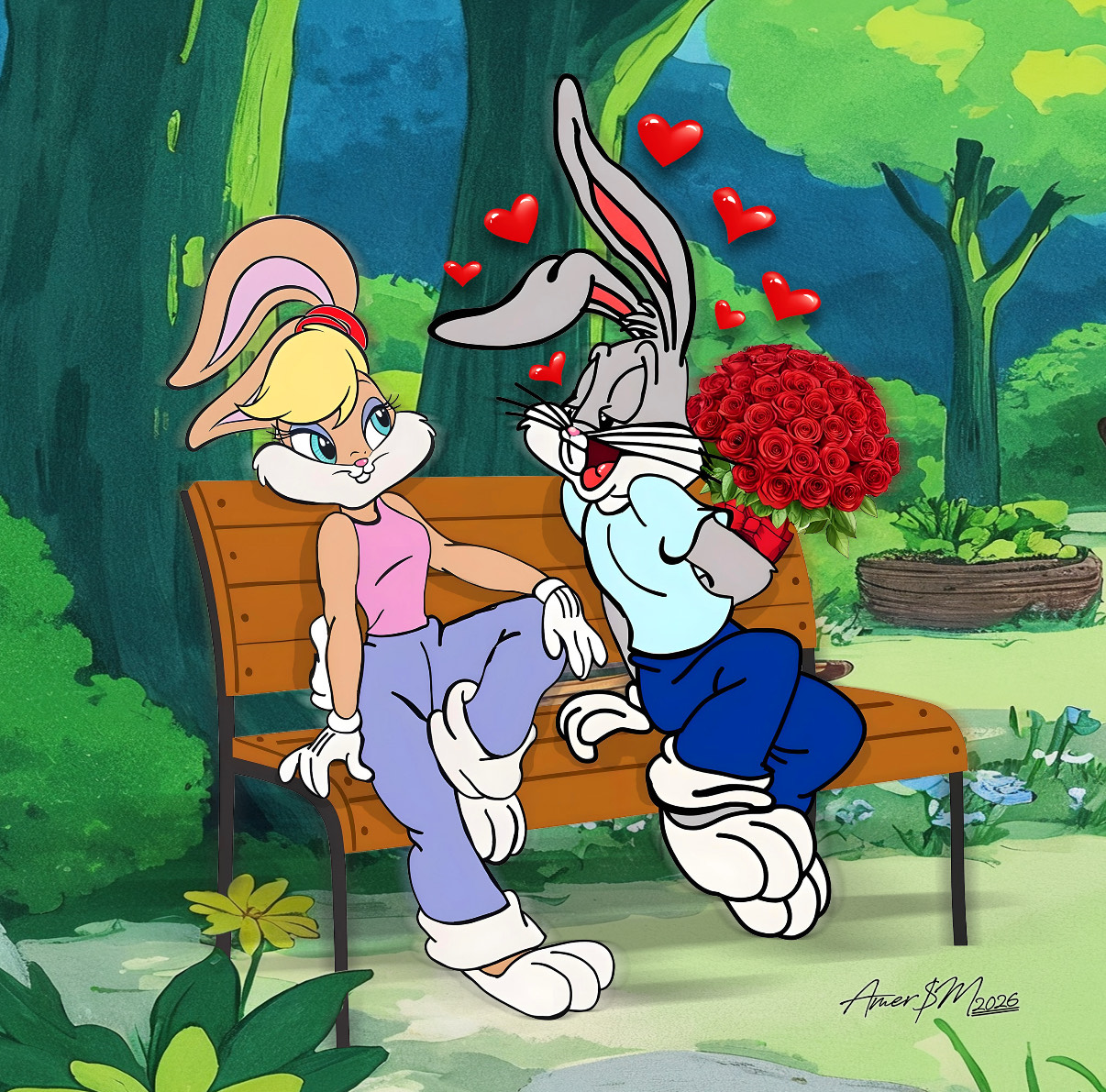 A lighthearted moment of charm and affection, where playful romance unfolds through laughter, glances, and a bouquet held just out of sight. Set in a storybook garden, this piece captures the innocence of young love and the joy of simple gestures that say everything without words. Created as a mixed-media work on a gallery-wrapped canvas, finished in oil gloss, and presented in a white floating frame.